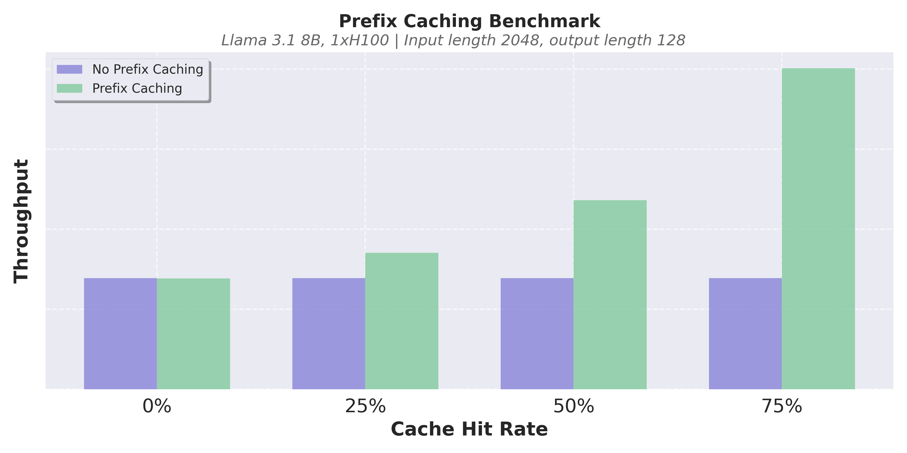 Here are some benchmark results. In our experiments, we observed that V1’s perfix caching causes less than 1% decrease in throughput even when the cache hit rate is 0%, while it improves the performance several times when the cache hit rate is high. Thanks to the near-zero overhead, we now enable prefix caching by default in V1.